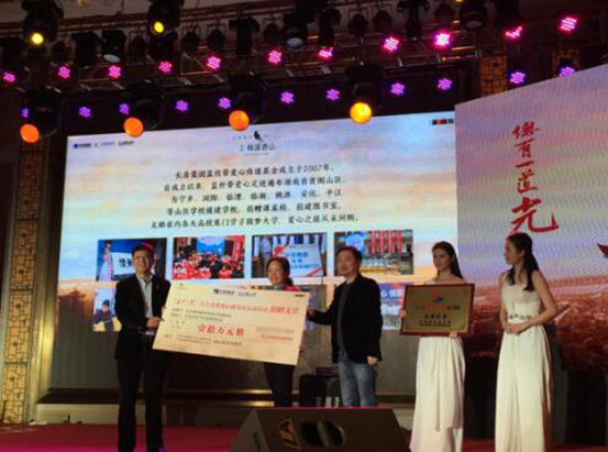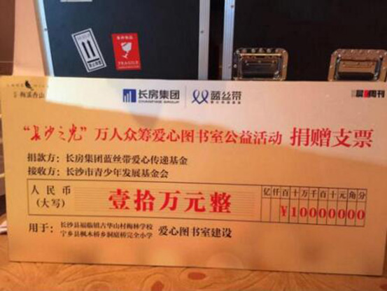 2016年初,晨報周刊攜手長房梅溪香山、長房集團藍絲帶愛心傳遞基金共同發起“萬人眾籌圖書館”愛心公益活動,為湖南貧困山區學校捐建圖書室。以點亮希望之光、傳遞溫暖力量為主題的“長沙之光”微信文稿每被轉發一次,即為籌建山區學校愛心圖書室捐贈5元。活動開展以來,贏得了許多社會愛心人士的熱烈反響和廣泛共鳴,共有1萬余人次參與活動,最終,通過長房集團藍絲帶愛心傳遞基金捐款10萬元,用于長沙縣福臨鎮古華山村梅林小學和寧鄉縣灰湯鎮洞庭橋完全小學兩所貧困學校愛心書屋的建設,長沙市基少年發展基金會理事長羊舒麟代表兩所學校接收捐贈。
